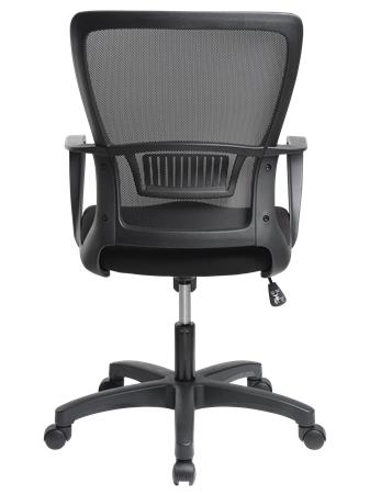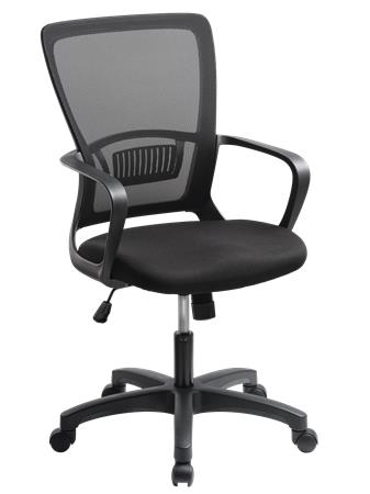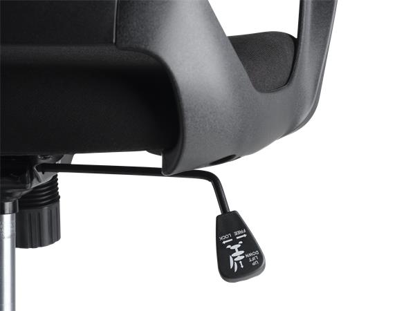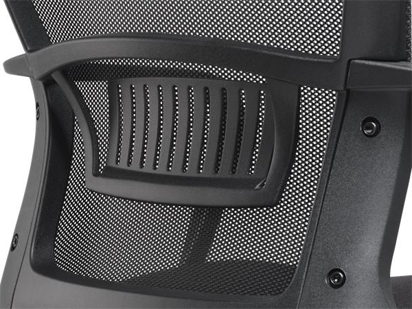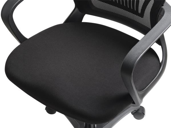 Kancelárska stolička s pohodlným sedadlom dizajnové prevedenie výškové nastavenie pomocou plynového piestu pevná, priedušná sieťovaná opierka chrbta nastaviteľná bedrová opierka aretovateľná hojdacia mechanika pevné opierky nosnosť: 110 kg Poťah: sedadlo: odolná, protioderová látka operadlo: napnutá sieťovaná tkanina
