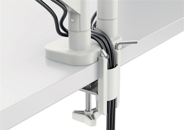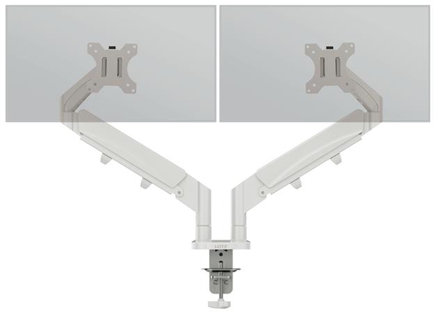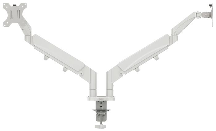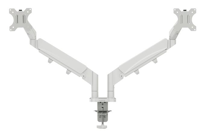 Pri správnom ergonomickom nastavení podľa odporúčaní má dvojité priestorovo úsporné rameno Leitz na monitor a notebook pozitívny vplyv na držanie tela, podporuje správny uhol na sledovanie a zlepšuje pohodlie a komfort krku a ramien. Držiak na monitor zostáva stabilný vo všetkých výškach a uhloch a umožňuje ľahké otáčanie monitora na šírku aj na výšku. Vďaka svojmu dizajnu sa hodí tam, kde je málo miesta, umožní vám získať cenný priestor na pracovnej ploche. Ergonomicky navrhnuté na podporu fyzickej pohody pri práci a zvýšenie produktivity. Monitory možno nastaviť úplne nezávisle od seba, kratšie nosné ramená umožňujú bezproblémové zarovnanie monitorov rôznych veľkostí. Dvojité rameno s pružinovou oporou na jednoduché nastavenie výšky monitora (185–435 mm). Jednoduché nastavenie výšky, hĺbky a uhla jednou rukou: otáčanie doľava a doprava o +90°/-90°, horizontálne a vertikálne otočenie monitora až do 180°, náklon obrazovky +55°/-55°. Pevná a stabilná konštrukcia pre dva ploché alebo zakrivené monitory s uhlopriečkou 17–32", každý s hmotnosťou do 9 kg. Jednoduchá inštalácia pomocou priloženej rýchloupínacej odnímateľnej dosky Vesa® (75 a 100 mm) a silikónovej pogumovanej c-skrutky, ktorá znižuje vibrácie a chráni povrch stola, alebo pomocou priechodky v stole (rozsah hrúbky stola: 10–80 mm). Náradie na montáž a nastavenie je súčasťou balenia. Systém vedenia káblov zabezpečuje poriadok v kábloch monitora a tým aj lepšie usporiadanie pracovného priestoru. Certifikát IGR a TÜV. Rozmery:1120 x 110 x 600 mm. Hmotmosť: 5,5 kg